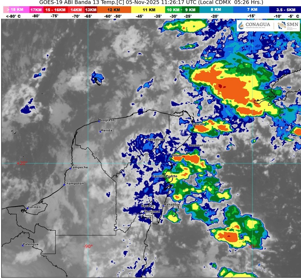 El clima para este miércoles 5 de noviembre de 2025 estará marcado por la convergencia de dos importantes fenómenos meteorológicos que impactarán directamente a la Península de Yucatán. El Frente Frío Número 12 se extiende sobre Quintana Roo y el noroeste del mar Caribe, interactuando simultáneamente con la Onda Tropical Número 40, que se desplaza sobre la península. Esta compleja interacción, sumada a una circulación ciclónica en niveles medios, es la causante del pronóstico de precipitaciones intensas.