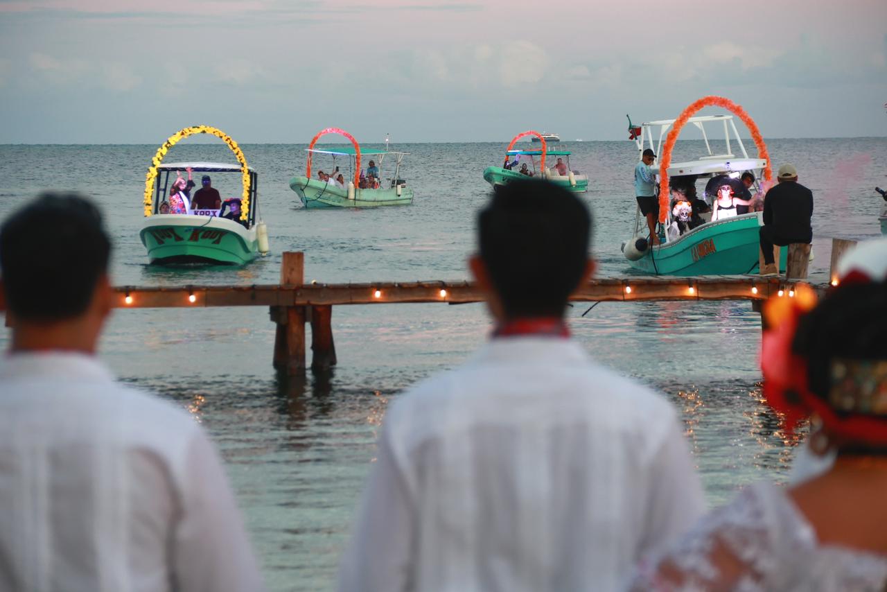 El misticismo y la conexión con el pasado se vivieron intensamente con la tradicional procesión marítima. Desde el muelle de la calle 45, las luces de las embarcaciones iluminaron el mar Caribe, mientras el profundo aroma del copal creaba un ambiente de armonía y espiritualidad. Esta representación evoca la creencia maya sobre el tránsito de las ánimas y es un elemento distintivo que hace único al Janal Pixan de Puerto Juárez. A esta emotiva bienvenida se sumó, de inmediato, el espectacular desfile de catrinas y catrines por la principal arteria de la subdelegación, una explosión de creatividad, elegancia y orgullo por las tradiciones mexicanas que arrancó aplausos de los asistentes.