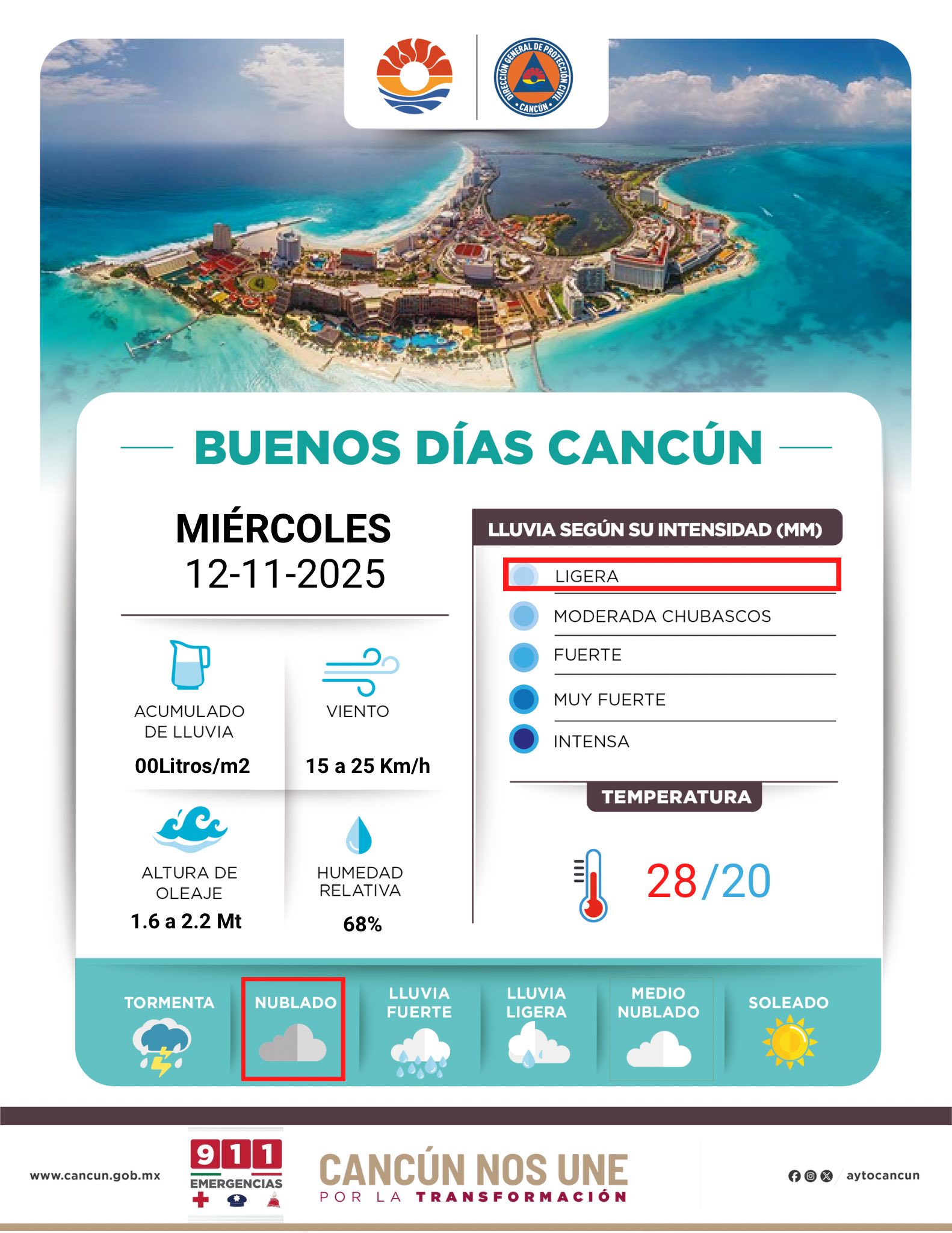 CANCÚN, Q. ROO. – Los cancunenses deben prepararse para un día con cielo de medio nublado a nublado este miércoles 12 de noviembre. El pronóstico meteorológico indica que se esperan lluvias ligeras y aisladas en diferentes momentos a lo largo del día. Aunque no se anticipan precipitaciones fuertes o continuas, se recomienda llevar consigo un paraguas o impermeable.