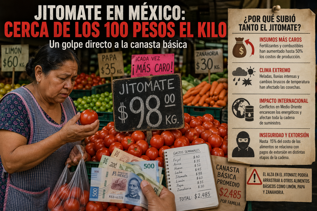 Ciudad de México, 21 de abril de 2026.– El precio del jitomate en México se ha convertido en uno de los principales focos de preocupación para consumidores y comerciantes. En apenas cuatro meses, este producto básico triplicó su costo y ya se acerca peligrosamente a los 100 pesos por kilo en algunos puntos del país.