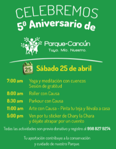 El 5Âș aniversario de Parque CancĂșn tambiĂ©n tiene un objetivo ambiental claro: promover la conservaciĂłn del espacio. Todas las actividades se realizan mediante donativo previo y registro, lo que contribuye directamente al mantenimiento y cuidado del parque.