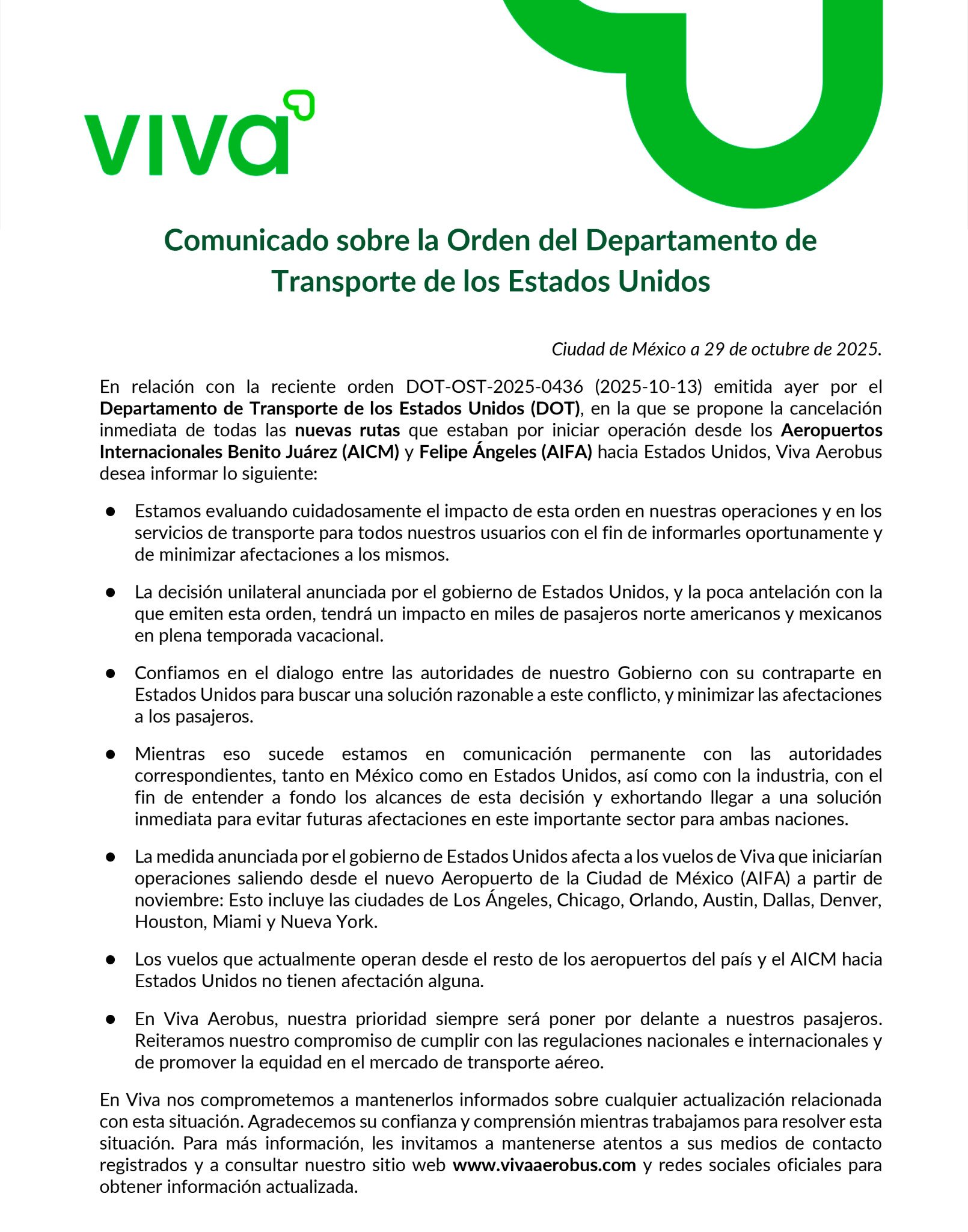 La aerolínea mexicana Viva Aerobús se encuentra en un proceso de análisis detallado tras recibir una orden directa del Departamento de Transporte de Estados Unidos (DOT), la cual suspende la aprobación de nuevas rutas aéreas comerciales desde el Aeropuerto Internacional Felipe Ángeles (AIFA) con destino a territorio estadounidense. Este anuncio ha generado incertidumbre en los planes de expansión de la compañía, que había apostado fuertemente por el nuevo aeropuerto para potenciar su oferta internacional. La aerolínea ha comunicado que está estudiando el impacto completo de esta decisión regulatoria en sus operaciones y en los pasajeros que ya esperaban estas nuevas opciones de viaje.