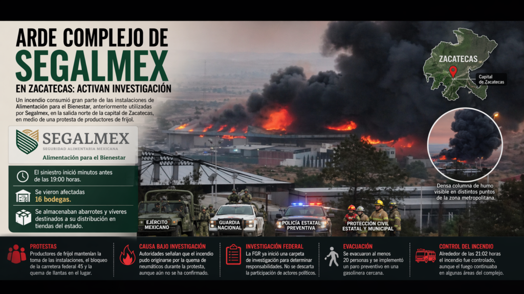 📢 Un incendio arrasó con las bodegas de Alimentación para el Bienestar en Zacatecas, sede de Segalmex. 👉 Autoridades investigan posible origen provocado.