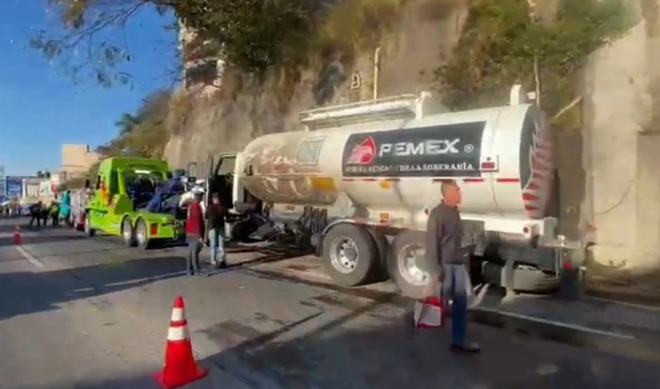 23 DE DICIEMBRE DEL 2025 – NACIONAL. Un fuerte accidente se registró la mañana de este martes cuando una pipa de Pemex cargada con combustible impactó contra un tráiler que transportaba productos de abarrotes y limpieza. El choque ocurrió aproximadamente a las 5:00 horas en el libramiento de Cuernavaca, conocido como Paso Exprés, específicamente a la altura de la colonia Las Águilas. El incidente generó una gran movilización de los cuerpos de emergencia debido al peligro latente que representaba el cargamento de hidrocarburo.