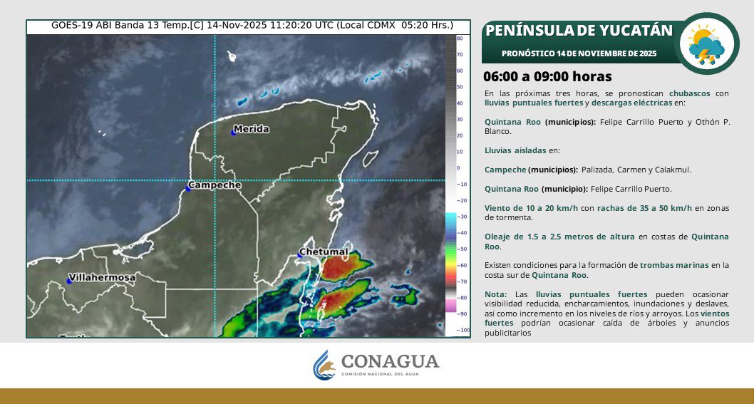 Cancún, Q. R., 14 de noviembre de 2025. El estado de Quintana Roo ha emitido una alerta a la población ante el pronóstico de lluvias intensas que afectarán principalmente la región sur. La advertencia meteorológica indica que se esperan lluvias muy fuertes con acumulados puntuales de hasta 75 a 150 mm, una cantidad significativa que podría generar afectaciones en zonas vulnerables. Ante esta situación, se ha hecho un llamado urgente a todos los quintanarroenses para que tomen las precauciones necesarias.