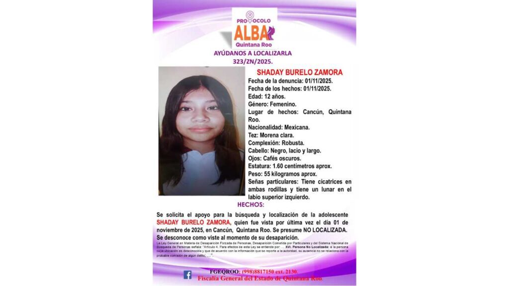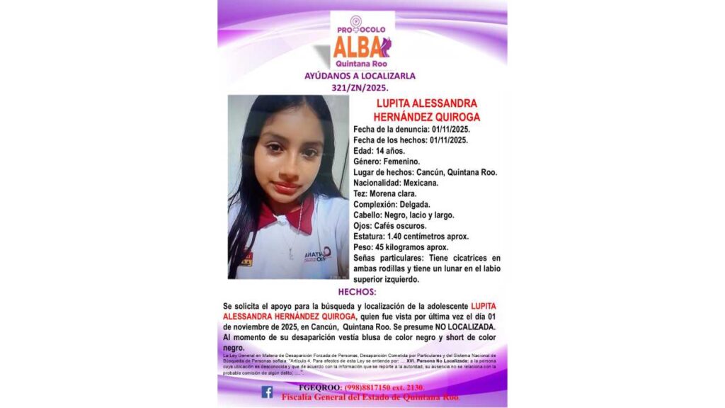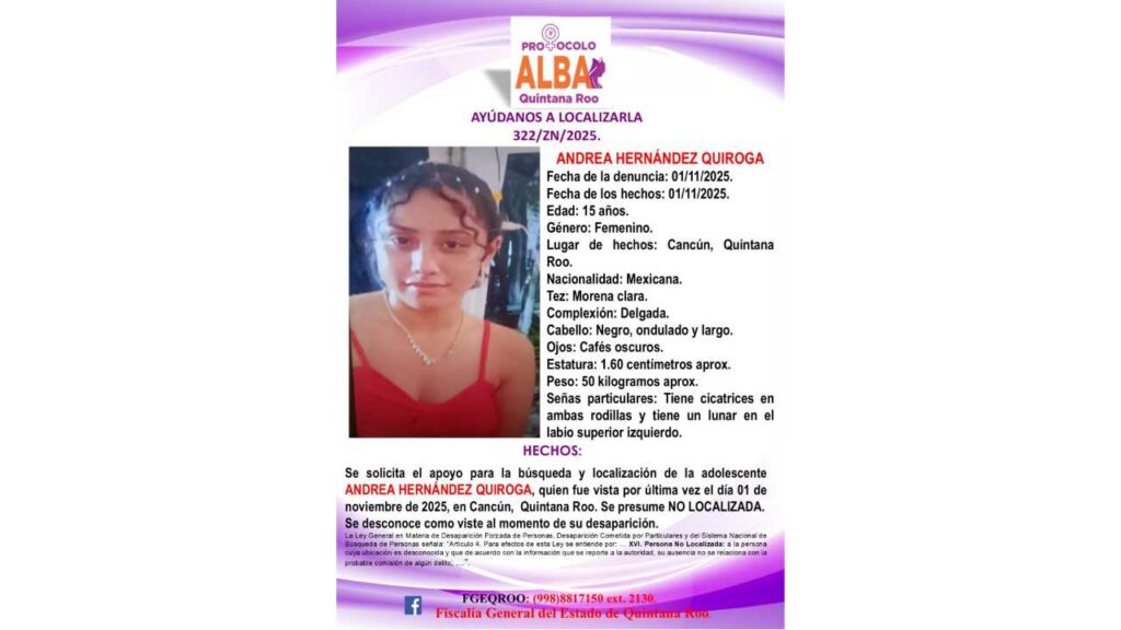 La Fiscalía General del Estado (FGE) de Quintana Roo ha emitido una alerta urgente en Cancún tras el reporte de la desaparición de tres adolescentes: Andrea Hernández Quiroga (15 años), Lupita Alessandra Hernández Quiroga (14 años) y Shaday Burelo Zamora (12 años). Las tres fueron vistas por última vez el 1 de noviembre de 2025 en el municipio de Benito Juárez, por lo que las autoridades han solicitado el apoyo inmediato de la ciudadanía para obtener información que permita dar con su paradero.