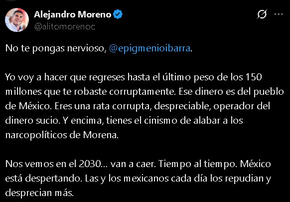 Moreno utilizó sus redes sociales para difundir el señalamiento, asegurando que el dinero presuntamente desviado “pertenece al pueblo de México”. En su mensaje, el líder del PRI adoptó un discurso directo y confrontativo, en el que también acusó a Ibarra de ser operador de recursos ilícitos y de respaldar a figuras políticas vinculadas con Morena, lo que intensificó el debate político y mediático