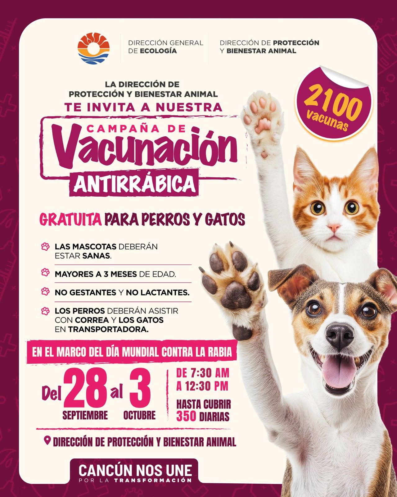 Cancún, Q. R., a 26 de septiembre de 2025.- En una importante acción de salud pública y bienestar animal, la Presidenta Municipal, Ana Paty Peralta, ha extendido una invitación a toda la ciudadanía para participar activamente en la Campaña de Vacunación Antirrábica gratuita para perros y gatos. Esta jornada se realiza en el marco del Día Mundial contra la Rabia, que se conmemora anualmente cada 28 de septiembre. La campaña se llevará a cabo del 28 de septiembre al 03 de octubre.
