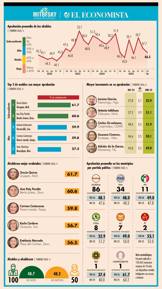 25 de Febrero del 2026.- La presidenta municipal de Benito Juárez, Ana Paty Peralta, se ha consolidado como una de las figuras políticas con mayor respaldo en todo México. Según la más reciente encuesta de la empresa Mitofsky, publicada por el diario El Economista en febrero de 2026, la alcaldesa de Cancún alcanzó un impresionante 60.6 por ciento de apceptación de la ciudadanía. Este resultado la coloca en el primer lugar nacional entre los municipios más poblados del país, demostrando una conexión sólida con los habitantes de la región.