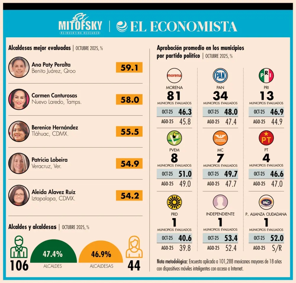27 de Octubre del 2025.- La presidenta municipal de Benito Juárez (Cancún), Ana Paty Peralta, ha alcanzado un logro destacado a nivel nacional. Se posicionó como la alcaldesa mejor evaluada de todo México en la más reciente encuesta de Mitofsky, correspondiente al mes de octubre de 2025. Este importante reconocimiento fue difundido por el periódico El Economista, que la coloca en la cima del «Ranking de 150 Alcaldes de México».