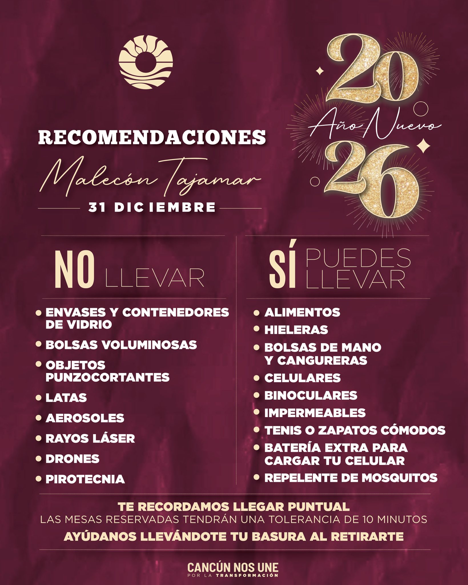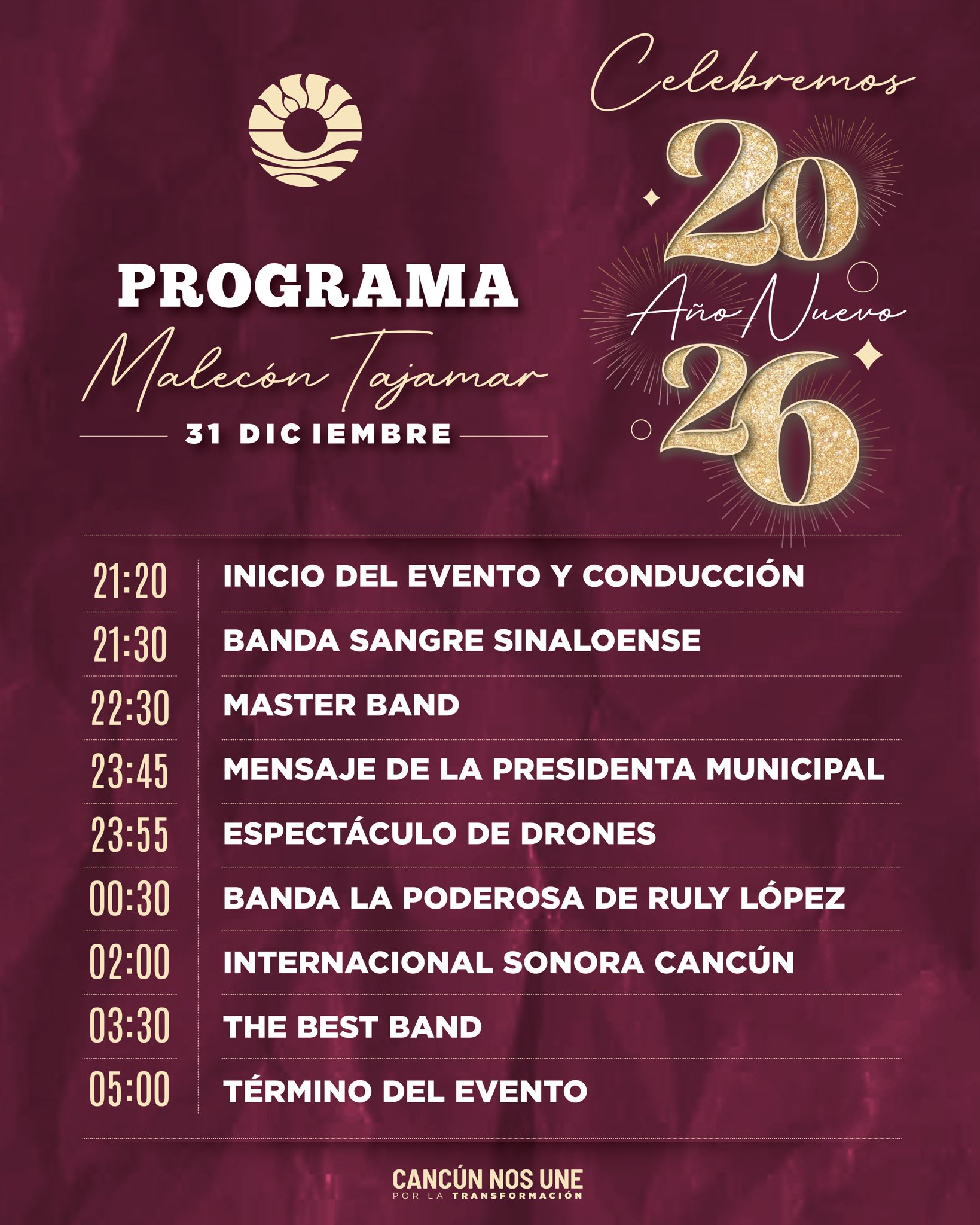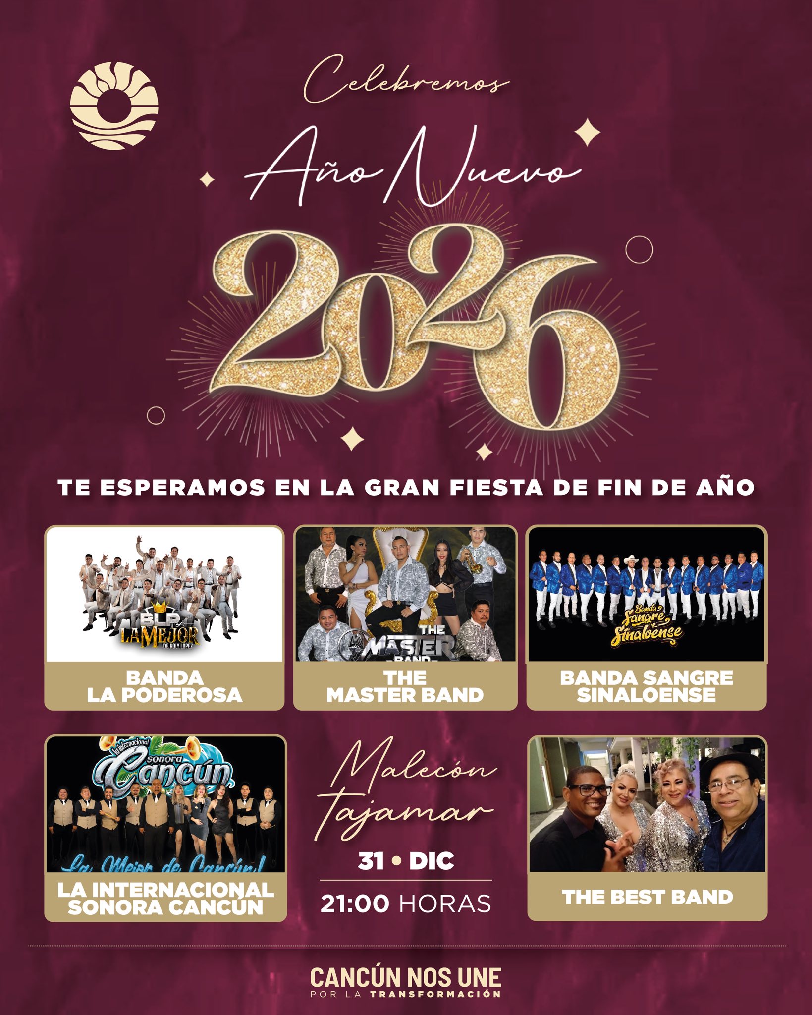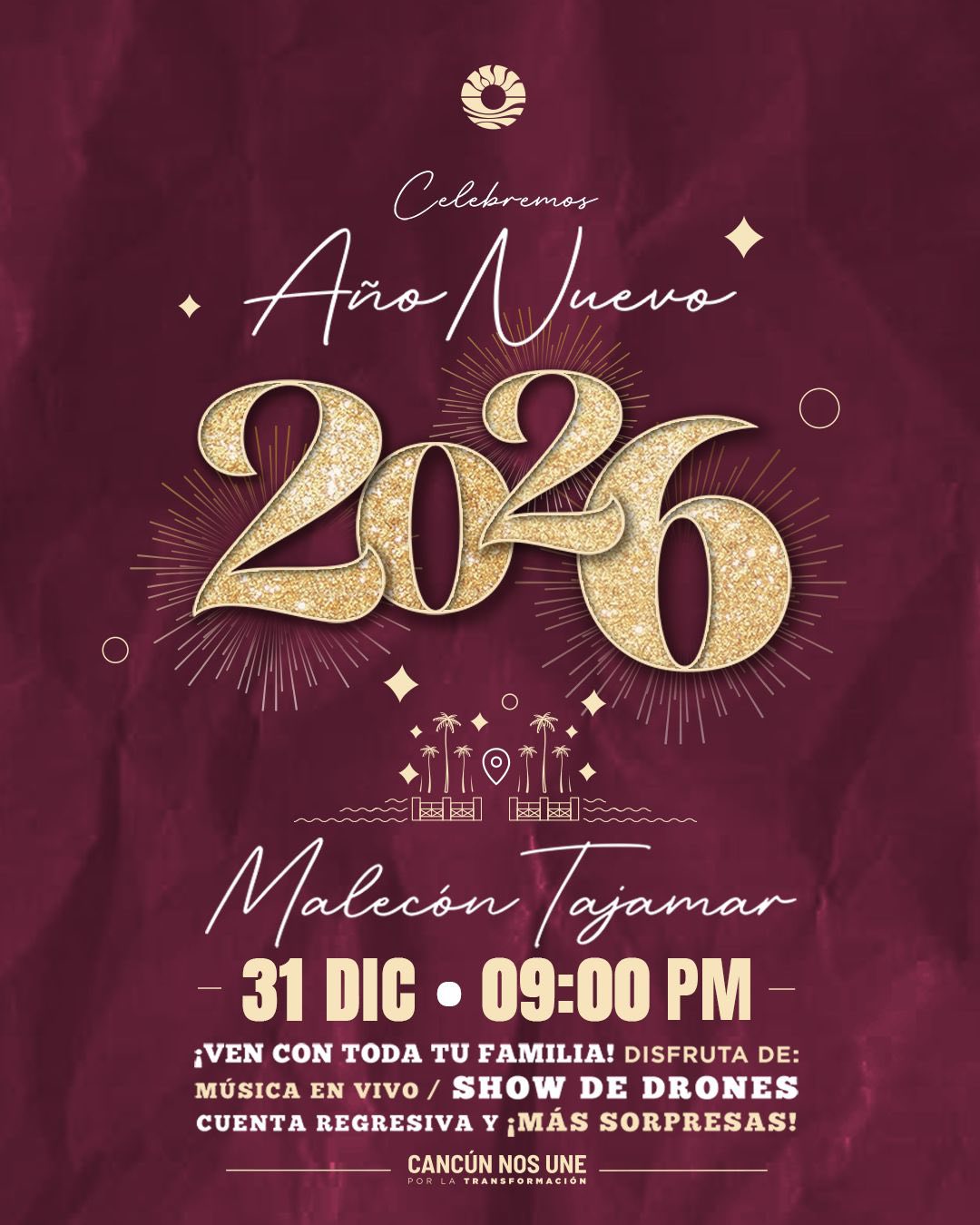 La invitación es abierta para todas y todos los ciudadanos que deseen formar parte de una velada llena de emociones positivas. La llegada del Año Nuevo 2026 estará acompañada de música en vivo, momentos especiales para compartir y una atmósfera diseñada para recibir un nuevo ciclo con optimismo, unión y buenos deseos para la comunidad cancunense.