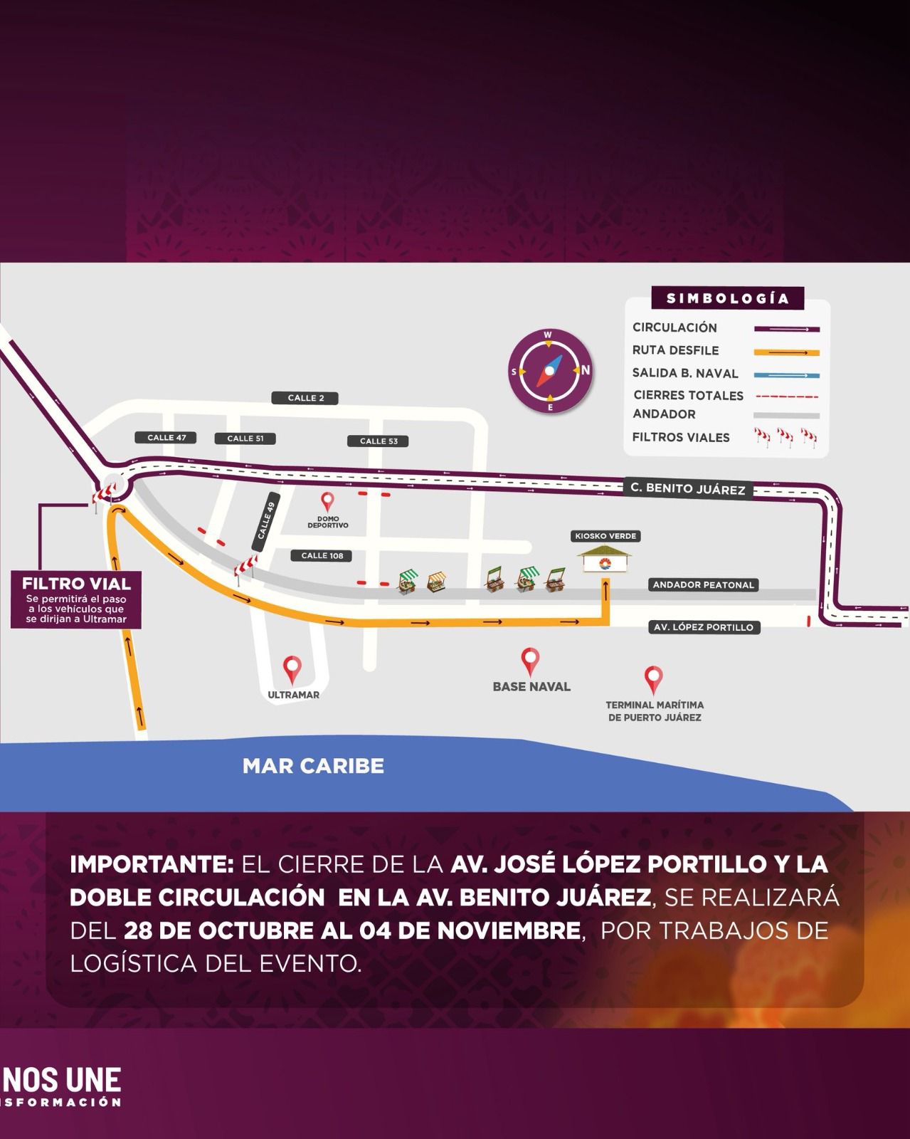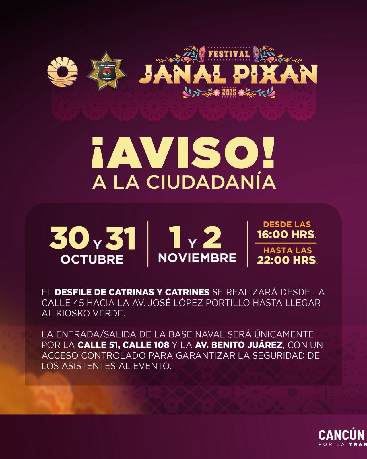 La sede principal de los festejos del Janal Pixán serán las inmediaciones de la Supermanzana 84, en Puerto Juárez. Debido a esto, se anunció un cierre a la circulación vehicular en la avenida José López Portillo. El tramo que será cerrado es el que va desde la calle 45 hasta llegar al cruce con la avenida Benito Juárez. Es importante señalar que este cierre solo aplicará por las tardes, en un horario de las 16:00 a las 22:00 horas.