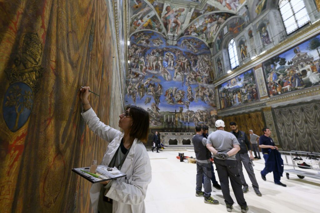 En las imágenes difundidas por el Vaticano también se ve a una trabajadora retocar con un pincel los frescos inferiores de la pared de la capilla, que simulan cortinajes.