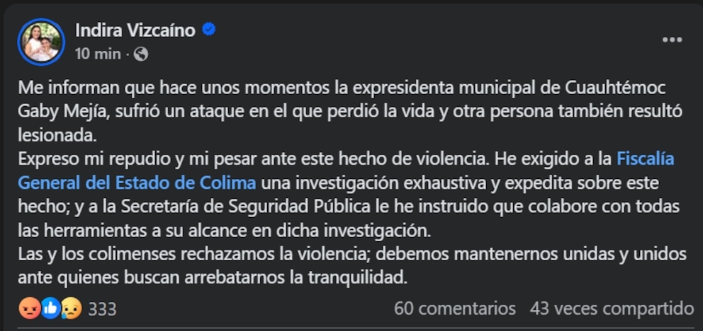 14 de Octubre del 2025.- La violencia ha vuelto a sacudir el ámbito político del estado de Colima, esta vez con el homicidio de Gabriela Mejía, quien se desempeñó como alcaldesa del municipio de Cuauhtémoc. La exfuncionaria perdió la vida durante un ataque armado ocurrido este martes 14 de octubre, en un suceso que también dejó como saldo a otra persona lesionada. La noticia fue confirmada por la propia gobernadora del estado, Indira Vizcaíno Silva, quien a través de un comunicado condenó enérgicamente los hechos y exigió a las autoridades correspondientes una investigación expedita para esclarecer el crimen y llevar a los responsables ante la justicia.