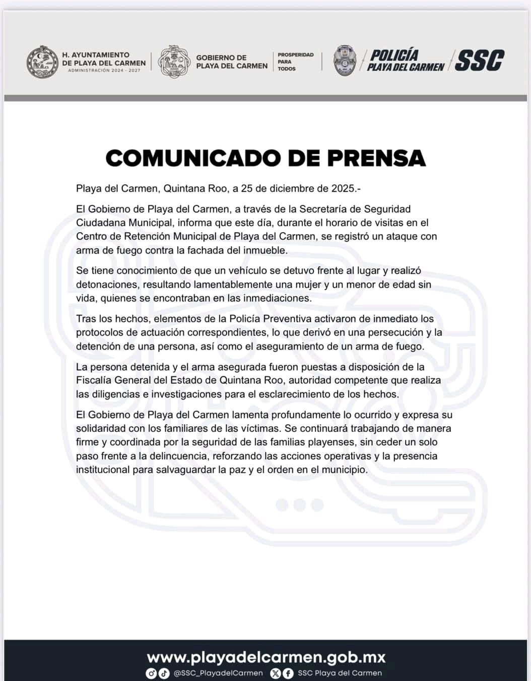 La mañana de este jueves 25 de diciembre se registró un asesinato en Playa del Carmen que conmocionó a la población, luego de que una mujer y un menor de edad fueran atacados a balazos a las afueras del centro de retención municipal. El hecho ocurrió en una zona con constante vigilancia, lo que generó una rápida movilización de cuerpos de seguridad y servicios de emergencia.