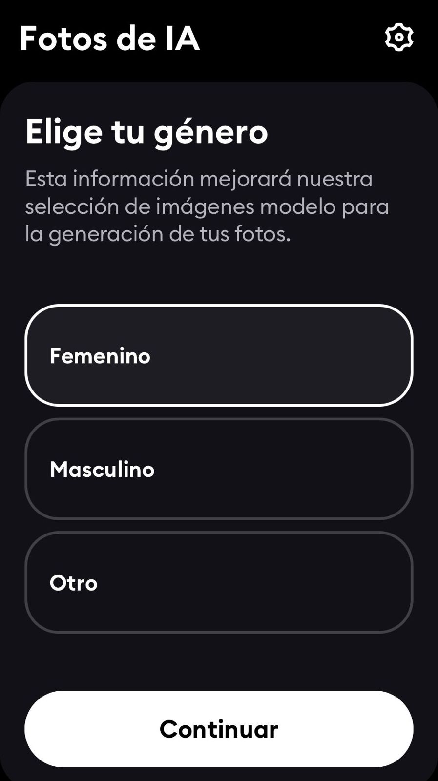 Una vez que tengan seleccionadas sus selfies (las cuales deben de cumplir con los parámetros que les pide la app, como salir en lugares iluminados y donde no haya más personas), le dan click a “Continuar”, escogen su género y después eligen el modelo de fotos que quieren.