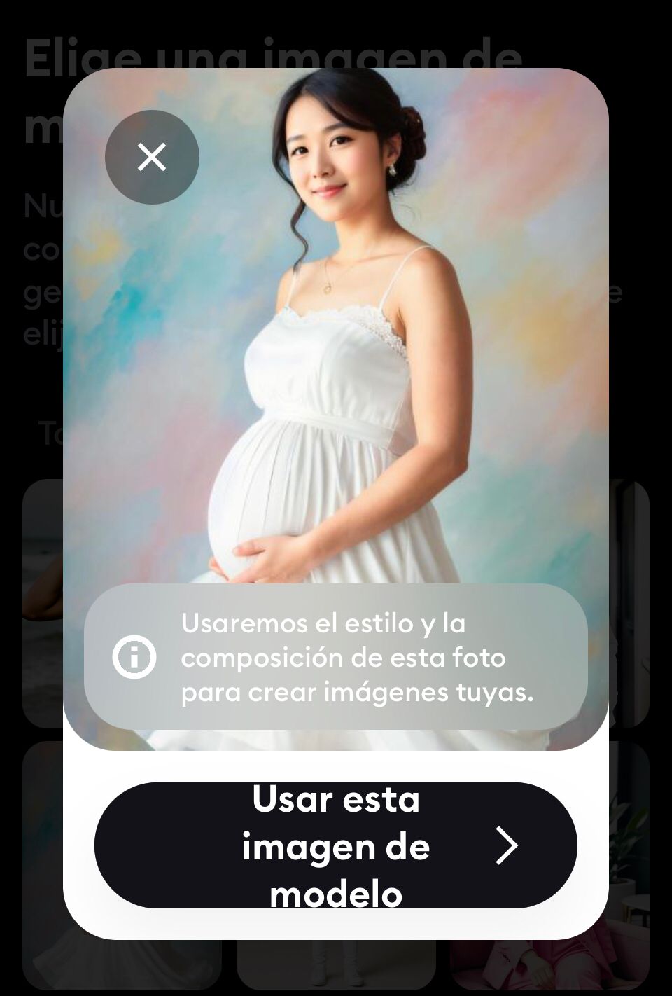 En el caso de este trend, escogeremos el modelo de fotos de embarazo. Al seleccionar la plantilla le dan en “Usar esta imagen de modelo” y posteriormente esperamos a que la IA haga su magia, algo que al principio tarda muchos minutos al principio.