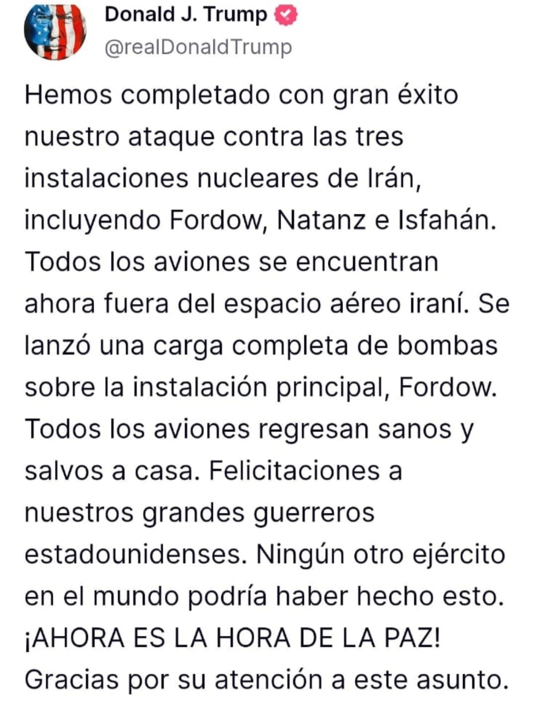 #EstadosUnidos bombardea sitios clave en #Irán.En un nuevo episodio que incrementa la tensión internacional, Estados Unidos atacó instalaciones nucleares en Irán, según lo confirmó el presidente Donald Trump a través de su red social Truth Social. Las instalaciones afectadas incluyen Fordow, Natanz e Isfahan, consideradas puntos estratégicos dentro del programa nuclear iraní. Trump aseguró que el ataque fue exitoso y que todos los aviones involucrados ya se encuentran fuera del espacio aéreo iraní.El mandatario estadounidense afirmó que “una carga completa de bombas fue lanzada en el sitio principal, Fordow”, añadiendo que los aviones están a salvo y de regreso. Además, felicitó a las fuerzas armadas norteamericanas llamándolos “grandes Guerreros Americanos”. Esta acción marca un punto crítico en las ya frágiles relaciones entre ambas naciones, que no tienen vínculos diplomáticos desde hace décadas.Trump llama a la paz mientras ordena retirada de ciudadanosPese al ataque militar, Trump envió un mensaje que ha generado controversia: “Ahora es el momento de la paz”,