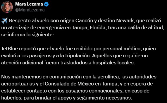 En México, la gobernadora de Quintana Roo, Mara Lezama Espinosa, confirmó el incidente a través de sus redes sociales. La mandataria informó que, según los reportes que recibió, el avión fue recibido en Tampa por personal médico. Este equipo evaluó de inmediato tanto a los pasajeros como a toda la tripulación para verificar su estado de salud.