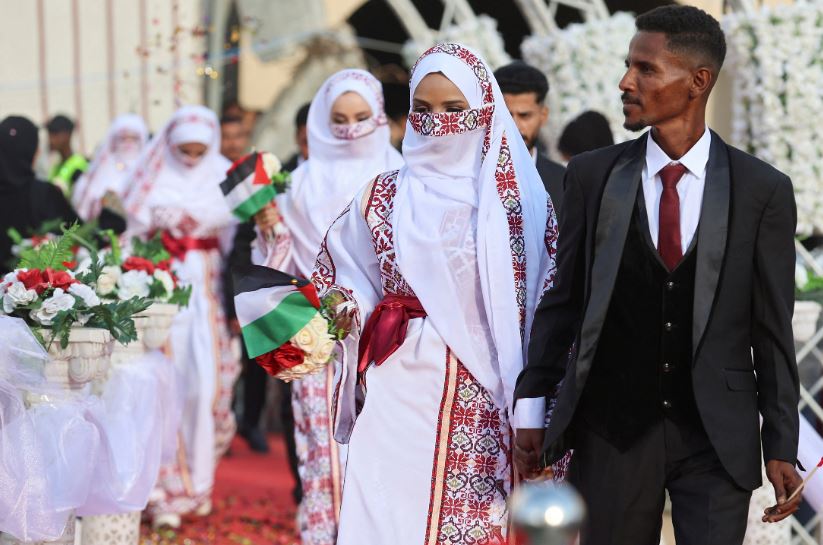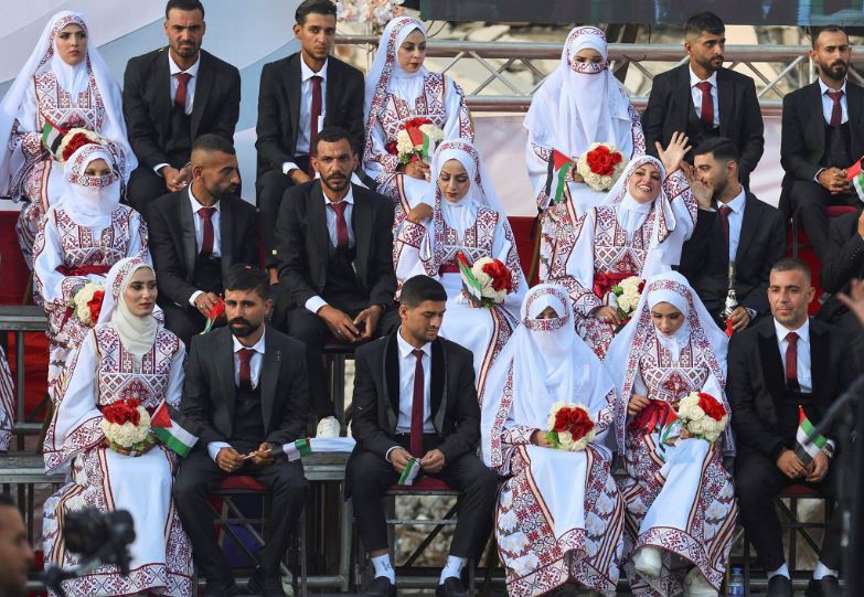 El enlace colectivo se celebró sobre un escenario nombrado “Thawb al-Farah”, que significa “el vestido de la alegría”, elegido para representar la búsqueda de un futuro pese al dolor acumulado. Aunque la zona está casi en ruinas, el sitio se llenó de banderas palestinas, flores, música tradicional y decenas de familias que quisieron acompañar a los nuevos matrimonios.