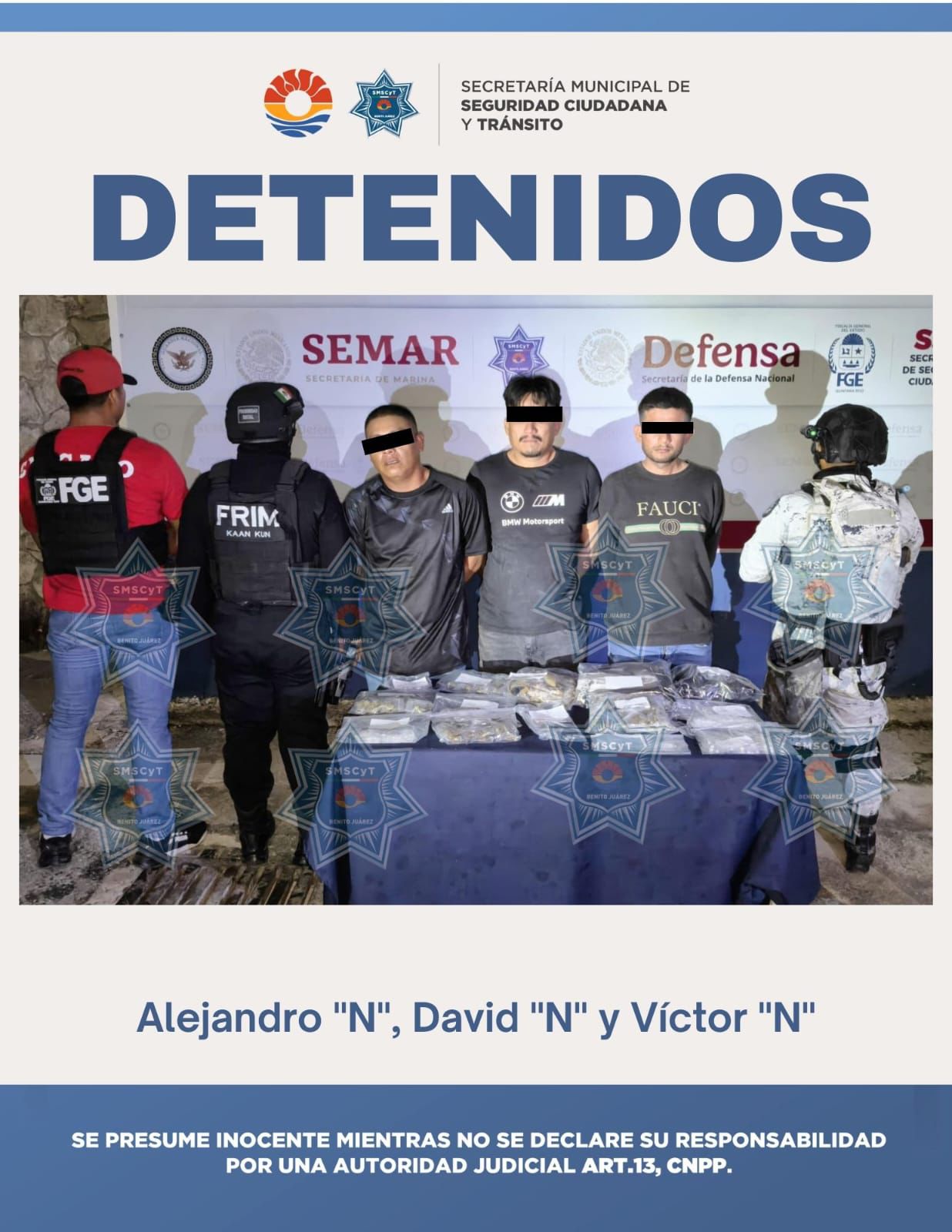 En una acción contundente para recuperar la tranquilidad en el municipio, elementos de la Secretaría Municipal de Seguridad Ciudadana y Tránsito, en conjunto con la Guardia Nacional y la Fiscalía General del Estado, lograron la captura de tres sujetos. Los implicados fueron sorprendidos en la Supermanzana 102 mientras manipulaban diversas sustancias ilícitas junto a un vehículo blanco. Esta detención representa un golpe importante a las estructuras locales que se dedican a los actos ilícitos de narcotráfico en la región.