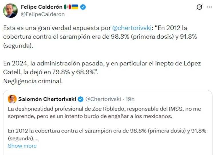 En otro mensaje, el exmandatario comparó la cobertura contra el brote de sarampión al final de su gobierno en 2012 con la registrada en años recientes. Indicó que entonces se alcanzaba 98.8 por ciento en primera dosis y 91.8 por ciento en segunda, mientras que en 2024 los niveles habrían bajado de forma considerable. Estas cifras, dijo, provienen de organismos internacionales de salud.