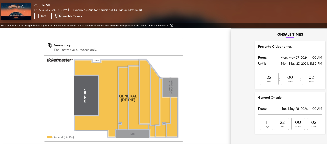 La preventa de boletos para el show de Camilo Séptimo será únicamente para clientes Citibanamex, aunque la venta general arrancará un día después (el martes 28 de mayo) a la misma hora y a través de las taquillas del Lunario, así como de la página de Ticketmaster.