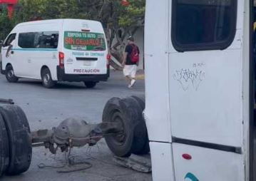 8-Septiembre-2025-.La mañana de este lunes, un camión de transporte público de la empresa Transportes Urbanos del Carmen (TUCSA) sufrió el desprendimiento de sus neumáticos traseros mientras circulaba vacío por la colonia Nicte-Ha, generando alarma entre vecinos y transeúntes de la zona.