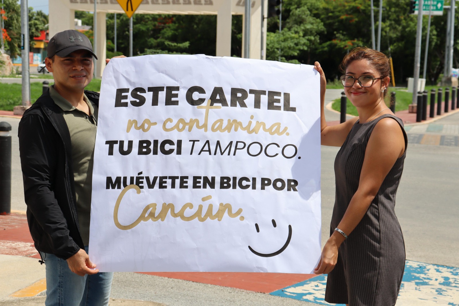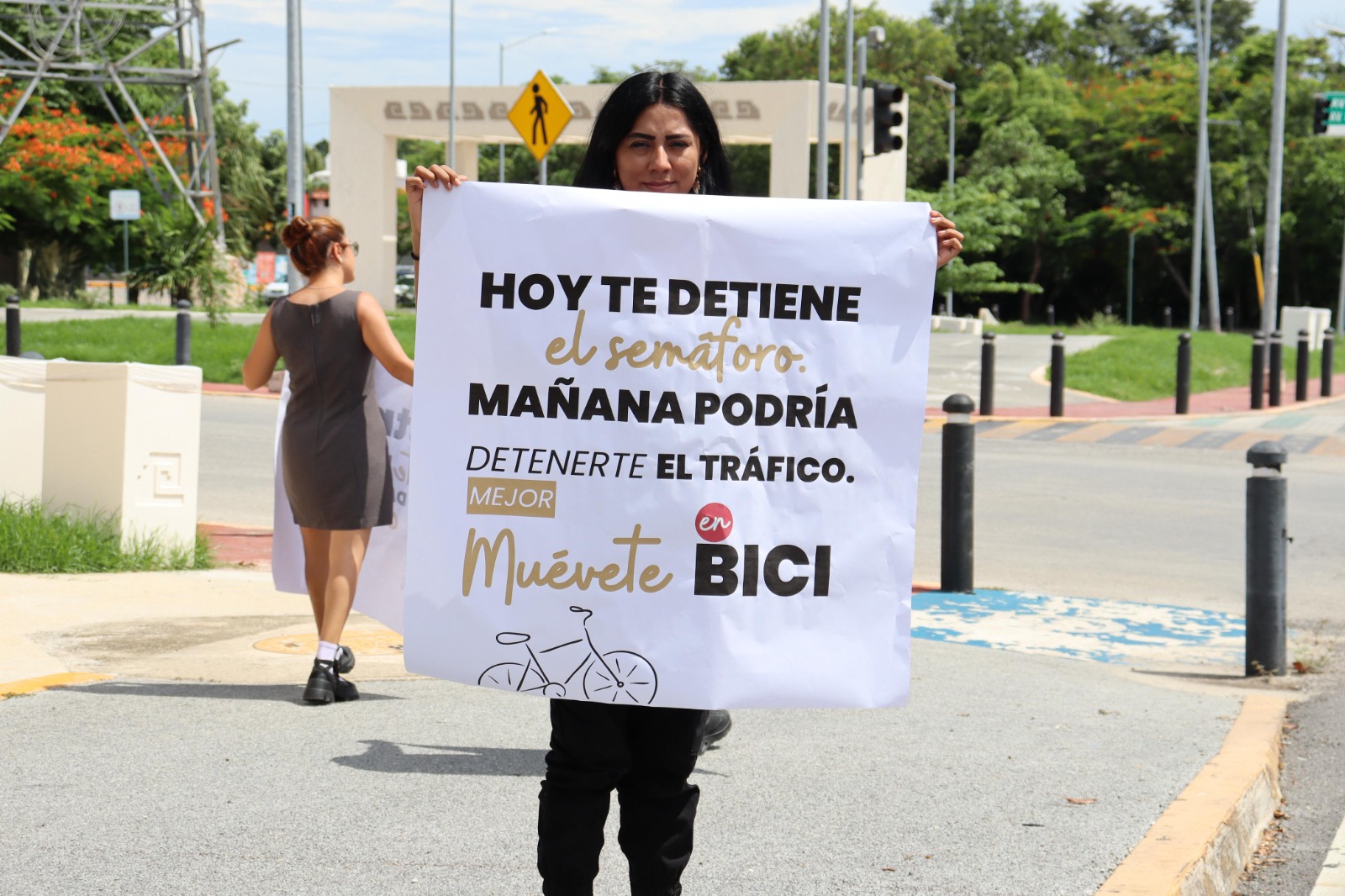 La intervención urbana incluyó mensajes originales y creativos para invitar directamente a la población a reflexionar sobre sus hábitos de desplazamiento. El personal del IMPLAN portó carteles con frases que buscaban generar un impacto positivo y, a la vez, conciencia. Mensajes como: “¿Estrés? Bájate del auto y da una caminata” o “Este cartel no contamina. Tu bici tampoco. Muévete en bici por Cancún”, generaron sonrisas y, al mismo tiempo, sembraron la importancia de caminar, usar la bicicleta y optar por el transporte público.