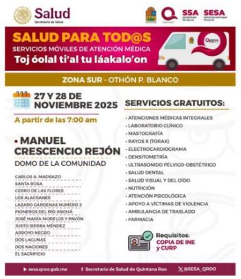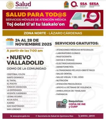 24 NOVIEMBRE 2025-QUINTANA ROO-Las Caravanas de Salud iniciaron una nueva jornada que busca acercar atención médica gratuita a las comunidades de Othón P. Blanco, Felipe Carrillo Puerto y Lázaro Cárdenas. Del 24 al 28 de noviembre, estas unidades móviles estarán recorriendo distintas localidades para ofrecer servicios esenciales que, en muchas ocasiones, no están disponibles de manera cercana para las familias. La estrategia pretende cubrir zonas de difícil acceso, donde la población depende de estos programas para recibir atención oportuna.