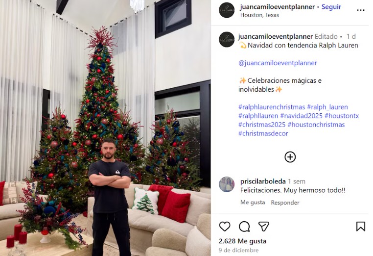 El interior de la residencia refleja un estilo elegante inspirado en la tendencia Ralph Lauren. Árboles de Navidad con esferas rojas, techos altos iluminados por candelabros y una chimenea central aportan un ambiente cálido y sofisticado que refuerza la imagen de un hogar cuidadosamente diseñado.