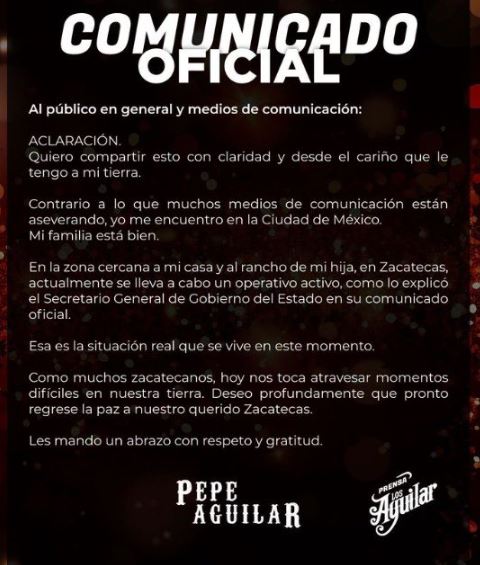 El despliegue de seguridad ocurre después de varios días de violencia en la zona, donde se reportaron bloqueos carreteros y enfrentamientos con saldo mortal, presuntamente ligados a grupos delictivos. En este contexto, el cantante aclaró públicamente que ningún integrante de su familia se encontraba en el lugar al momento de los hechos, aunque reconoció la cercanía del suceso con su vivienda y el rancho de su hija.