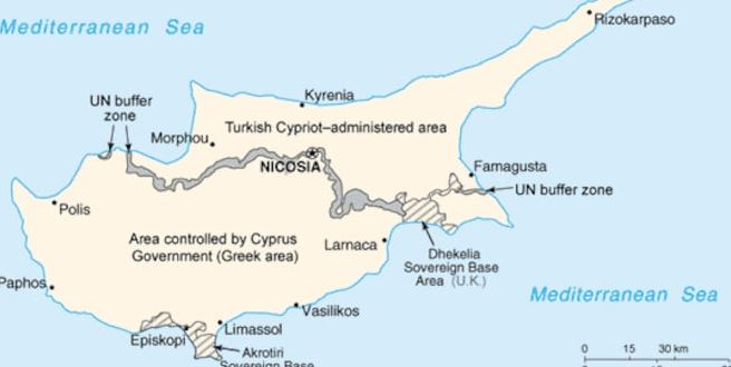 Se estima que cerca del 37 % del territorio permanece administrado por Turquía. Esta zona está separada del sur —reconocido internacionalmente y miembro de la Unión Europea— por una franja controlada por fuerzas de paz de la Organización de las Naciones Unidas. Incluso la capital, Nicosia, sigue dividida por esta línea de separación.