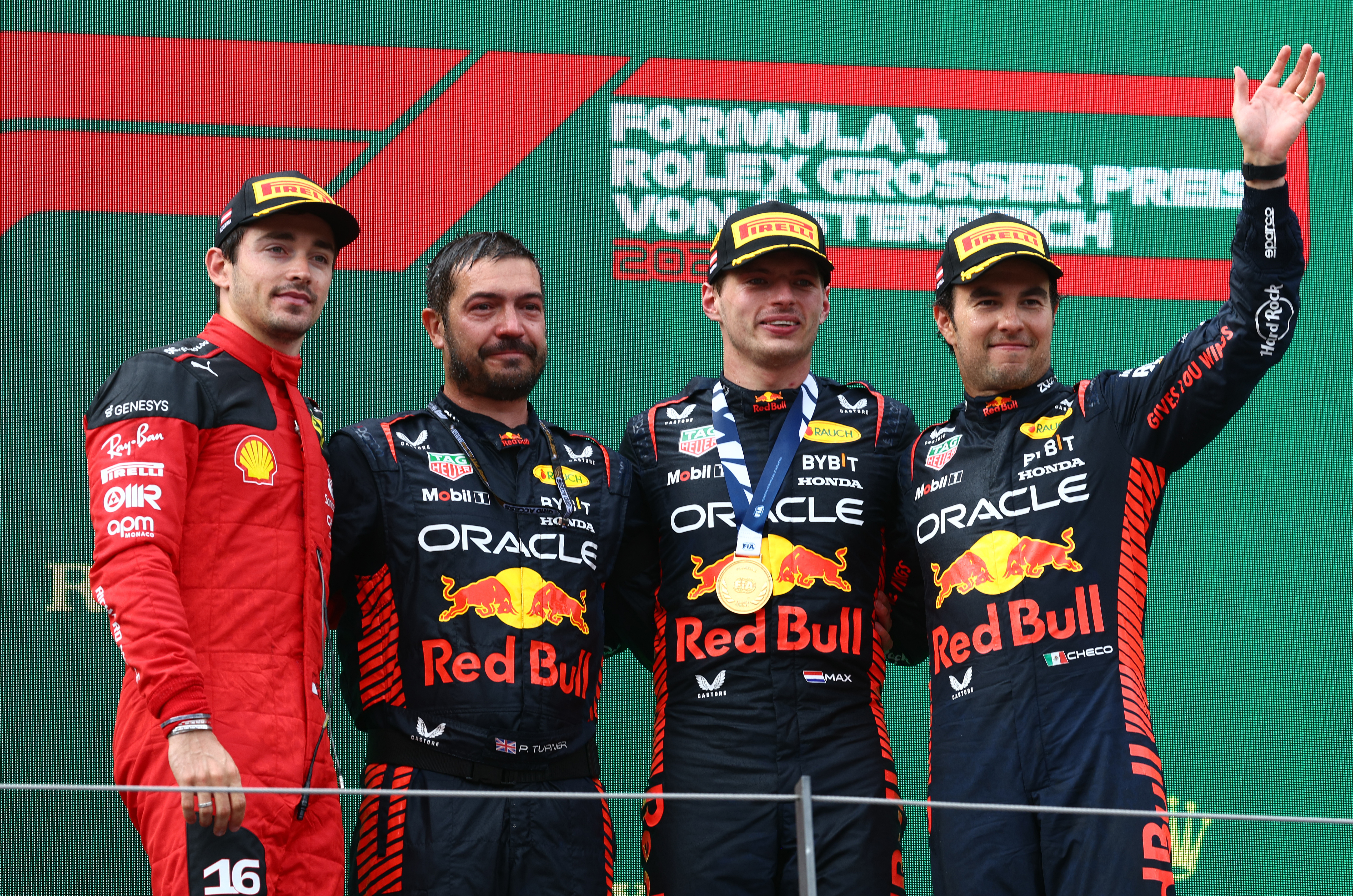 Max Verstappen, Charles Leclerc y Checo Pérez salieron bien librados de la lluvia se sanciones que hubo en el Red Bull Ring, ninguno de lo tres pilotos sufrió con los límites de pista y su lugar en el podio no fue modificado.