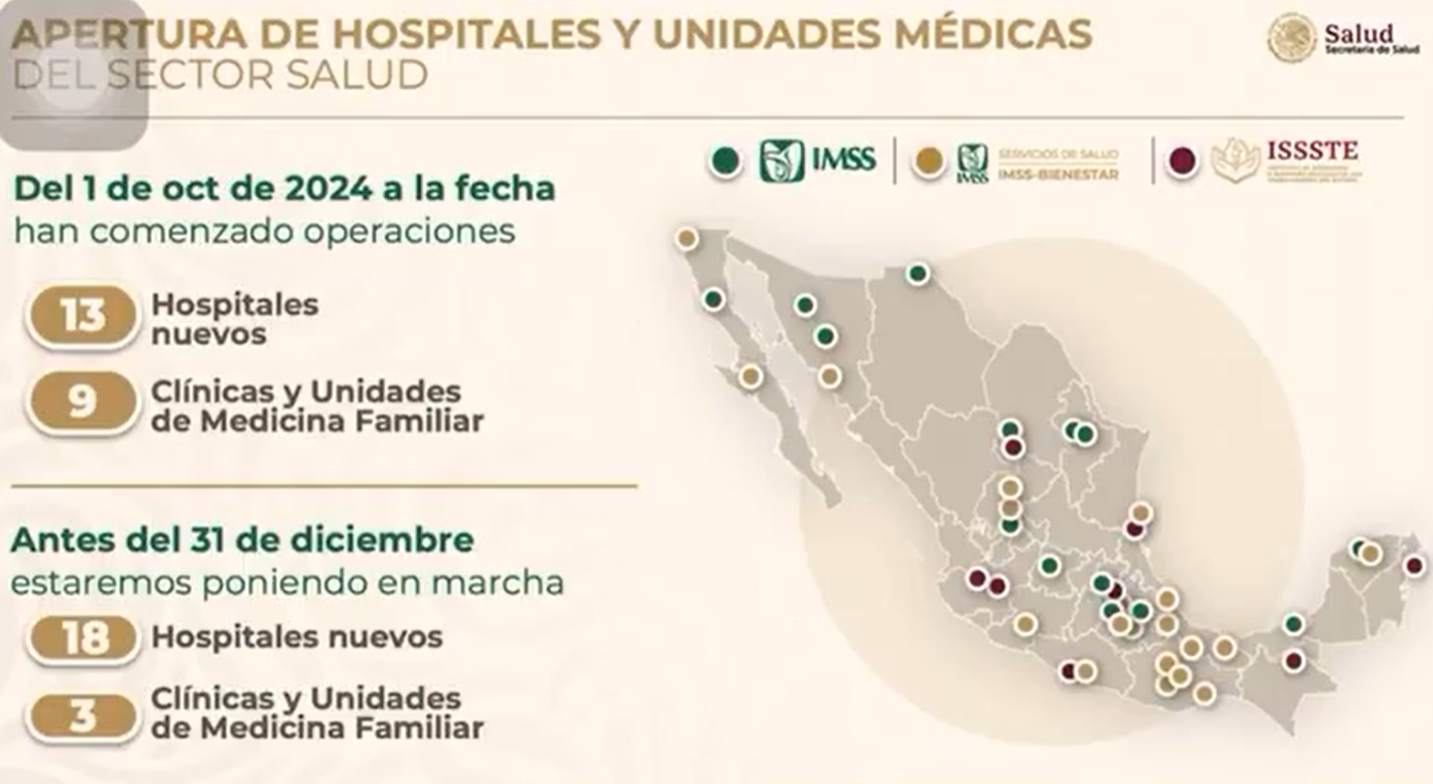 De acuerdo con Clark, los hospitales ya inaugurados incluyen el Hospital General Regional No. 2 en Ciudad Juárez, el Hospital General Regional No. 23 en Ensenada, la Unidad de Medicina Familiar No. 58 en Guadalupe, Zacatecas, la Unidad No. 73 en San Nicolás, Nuevo León, y la Unidad No. 93 en Torreón, Coahuila. También destacan el Hospital Comunitario de Palenque y la Clínica de Medicina Familiar en Pachuca, así como el Hospital Regional de Alta Especialidad del ISSSTE en Torreón.
