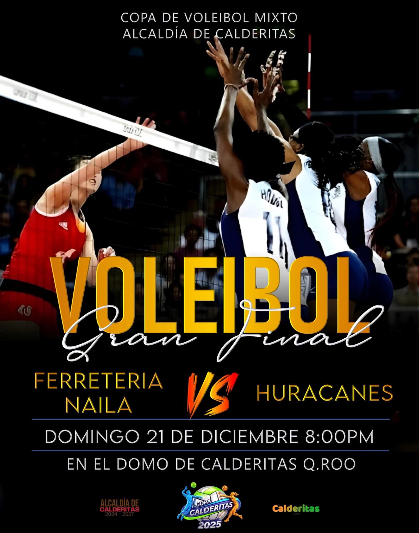 La gran final de la Copa de Voleibol Calderitas 2025 enfrentará a los equipos Ferretería Naila y Huracanes, dos escuadras que demostraron constancia, disciplina y alto nivel competitivo a lo largo del torneo. El encuentro promete ser intenso y lleno de emoción para quienes asistan al domo deportivo.