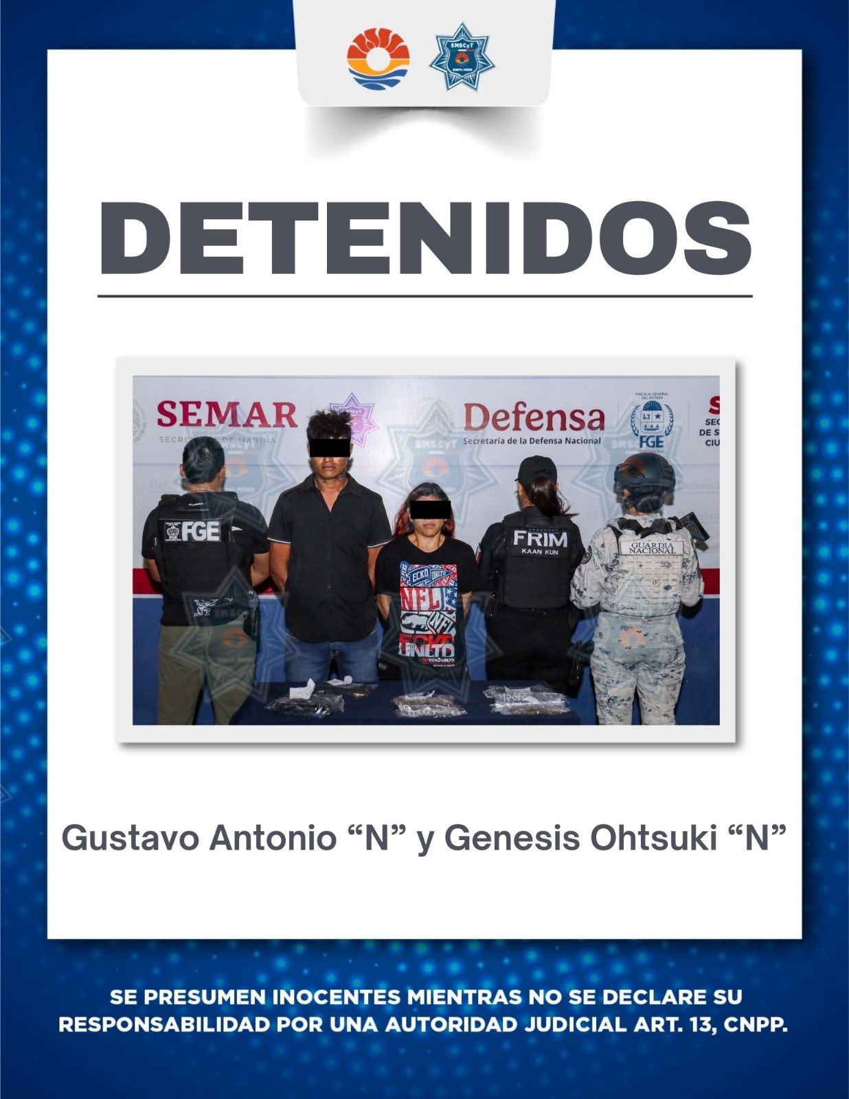 Como resultado del operativo, fueron detenidos Gustavo Antonio “N”, de 32 años de edad, y Génesis Ohtsuki, de 35 años, quienes quedaron a disposición de la Fiscalía General del Estado. Será esta autoridad la encargada de determinar su situación jurídica conforme a la ley, en el marco de las investigaciones relacionadas con delitos contra la salud y otros posibles ilícitos.