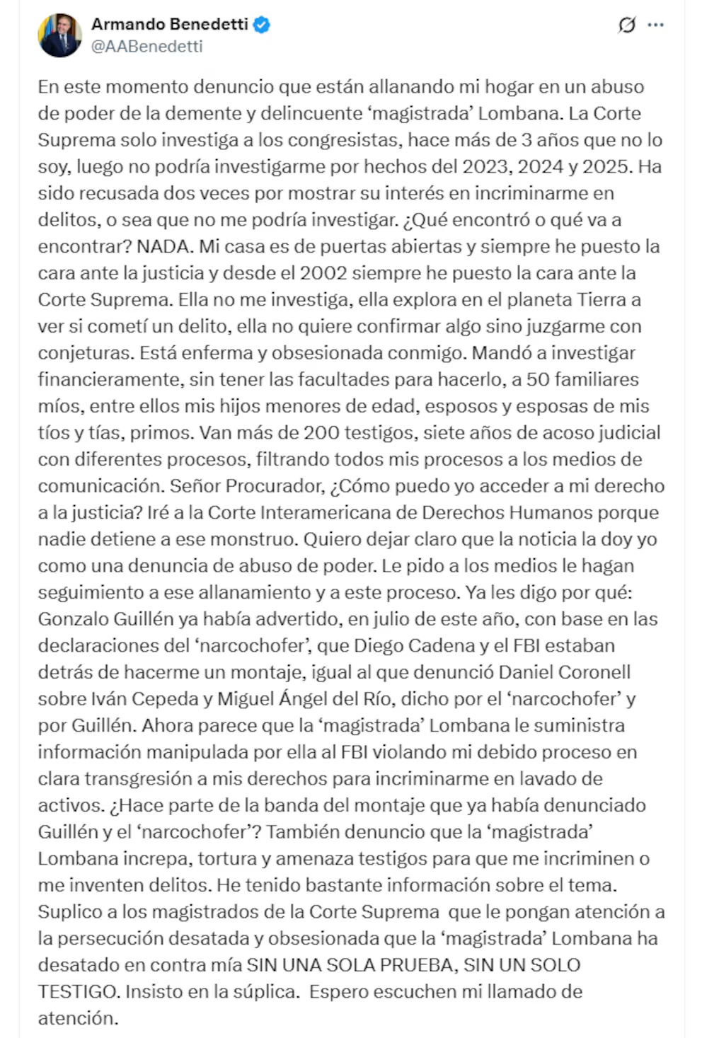 El jefe de la cartera del Interior responsabilizó directamente a la magistrada Cristina Lombana, quien hace parte de la Sala de Instrucción de la Corte Suprema de Justicia. Según el ministro, el supuesto allanamiento obedece a una «venganza» por parte de la funcionaria judicial. «En este momento denuncio que están allanando mi hogar en un abuso de poder de la demente y delincuente ‘magistrada’ Lombana», declaró Benedetti en su cuenta de X (anteriormente Twitter).