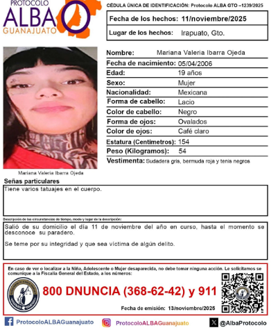 La última vez que se tuvo conocimiento de Marina Valeria Ibarra Ojeda fue el pasado martes 11 de noviembre. La joven desaparecida salió de su domicilio, ubicado en la colonia Esfuerzo Obrero de la ciudad de Irapuato, y desde entonces no ha regresado ni se ha comunicado con su familia. De manera inmediata, el Protocolo Alba se activó, emitiendo una ficha de búsqueda urgente para ayudar a su localización. Este protocolo es clave para coordinar la búsqueda de mujeres y niñas reportadas como desaparecidas en el estado, debido a la especial vulnerabilidad que enfrentan.