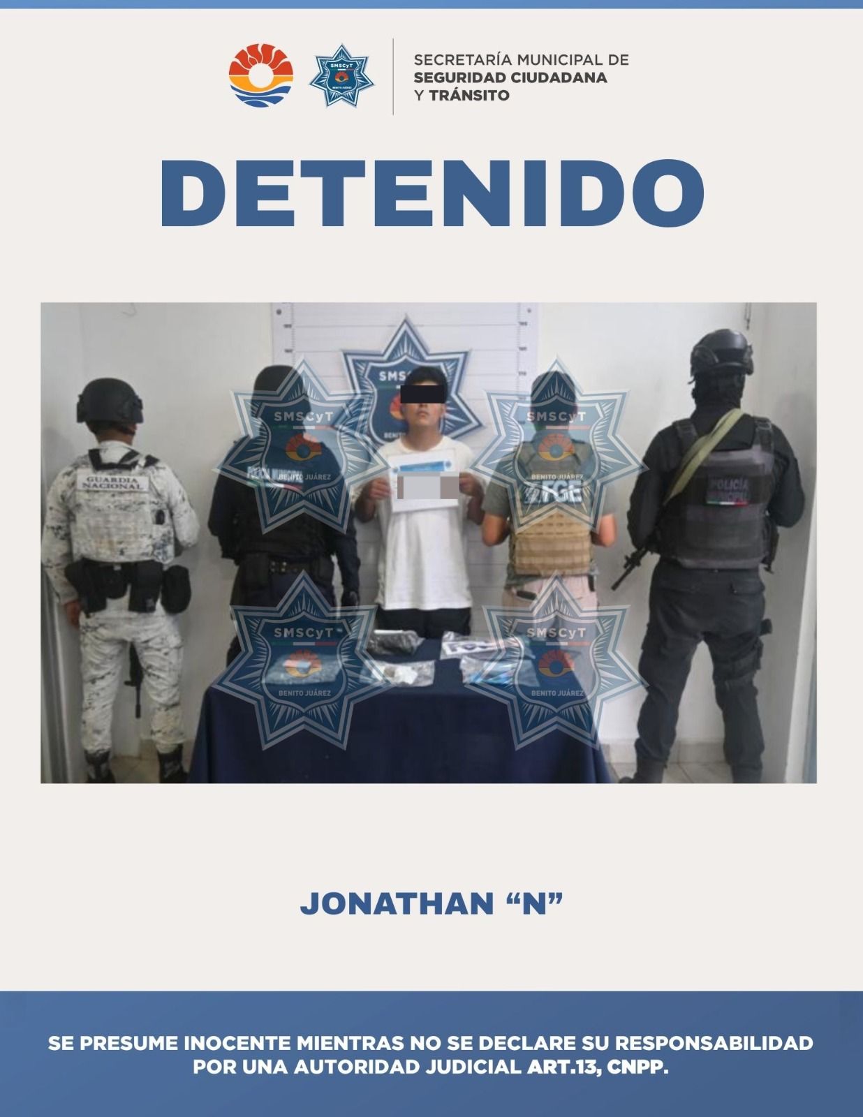 En una acción conjunta entre la Guardia Nacional, la Fiscalía General del Estado y la Secretaría Municipal de Seguridad Ciudadana y Tránsito de Benito Juárez, fue realizada la detención de un hombre presuntamente implicado en delitos contra la salud en su modalidad de narcomenudeo. El arresto se llevó a cabo como parte de las estrategias de vigilancia que se implementan para reforzar la seguridad en la ciudad.