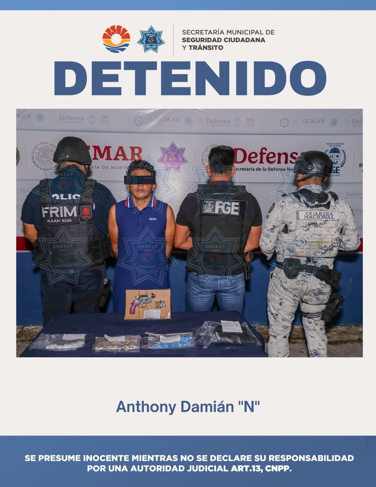Pero la detención no solo abarcó el tema de narcomenudeo. Al joven, identificado como Anthony Damián “N”, de 19 años de edad, también le fue asegurada un arma de fuego tipo revólver, calibre .38mm, lo cual constituye un delito federal grave por portación de arma. Este hallazgo reitera la conexión entre la venta de drogas y la posesión de armamento ilegal, reforzando la necesidad de los operativos coordinados como Blindaje Cancún.
