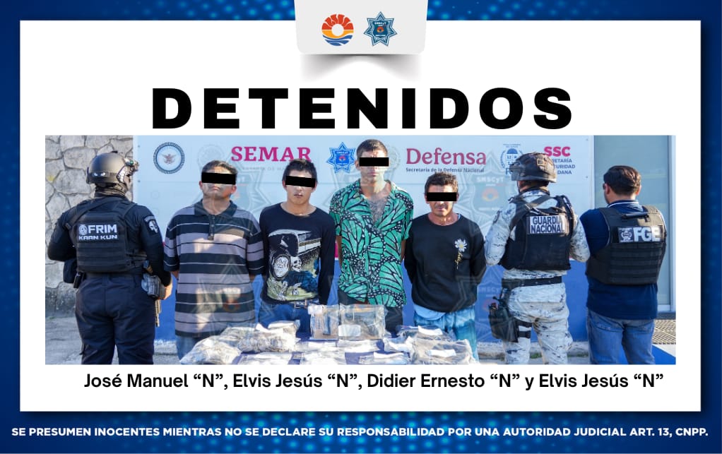Los detenidos fueron plenamente identificados por las autoridades como Elvis Jesús “N”, de 21 años; José Manuel “N”, de 22 años; Didier Ernesto “N”, de 31 años; y otro sujeto también llamado Elvis Jesús “N”, de 47 años de edad. Tras la custodia de los presuntos delincuentes, todos fueron trasladados a las instalaciones correspondientes para ser presentados ante el Ministerio Público. Ahí se definirá su situación jurídica en las próximas horas bajo los cargos de delitos contra la salud y portación de arma.