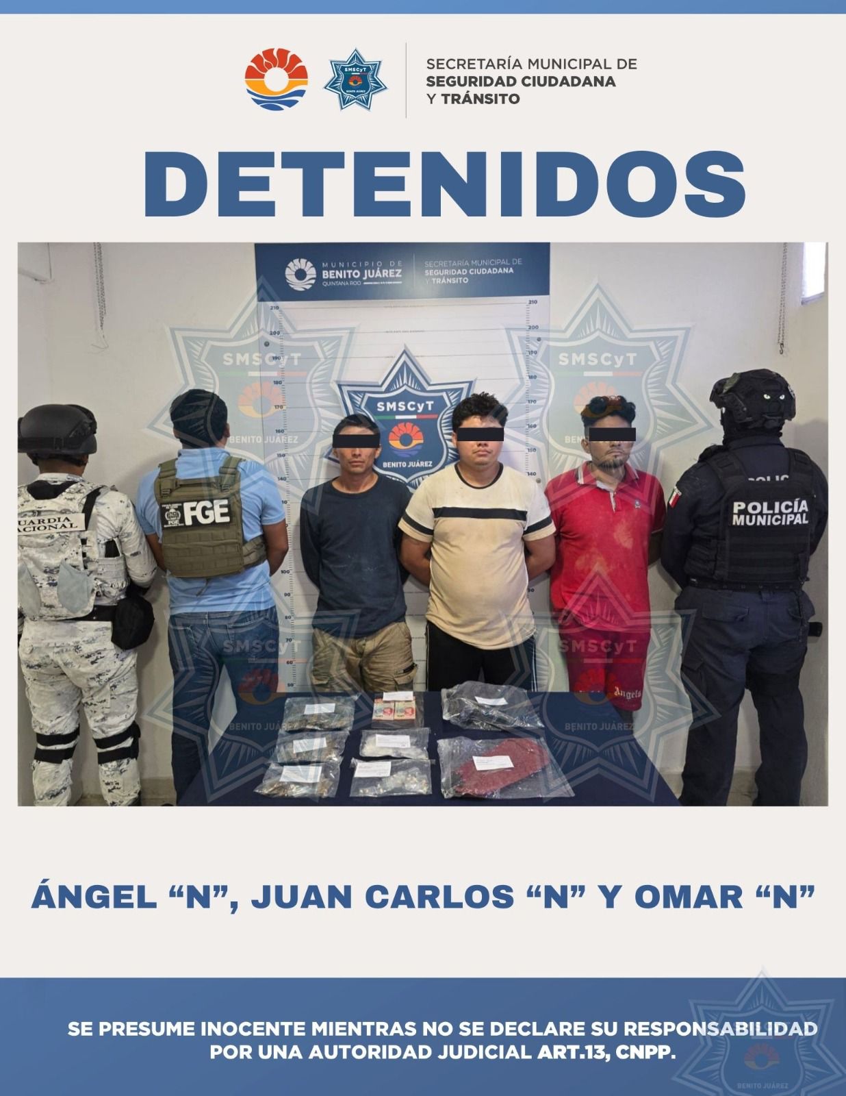 Cancún, Q. Roo., 30 de julio de 2025.– Como parte del operativo “Blindaje Cancún”, elementos de la Secretaría Municipal de Seguridad Ciudadana y Tránsito (SMSCyT) de Benito Juárez, en coordinación con la Fiscalía General del Estado, la Secretaría de Seguridad Ciudadana y la Guardia Nacional, detuvieron a tres hombres presuntamente implicados en delitos contra la salud en su modalidad de narcomenudeo. La acción se llevó a cabo durante recorridos de prevención en las inmediaciones de la Supermanzana 211.