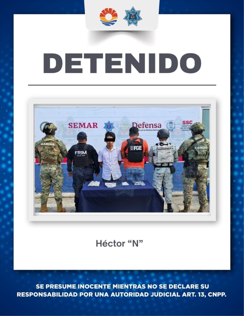 6 DE ABRIL DEL 2026 – LOCAL. Como parte de las estrategias permanentes de seguridad y prevención del delito en el municipio de Benito Juárez, agentes de la Policía Cancún lograron la captura de un sujeto en la colonia irregular El Milagro. Esta acción se llevó a cabo en estrecha coordinación con la Fiscalía General del Estado, la Guardia Nacional, el Ejército Mexicano y la Secretaría de Marina. El detenido fue puesto bajo custodia por su presunta participación en hechos que la ley señala como delitos contra la salud, específicamente por la posesión de diversas sustancias ilícitas.