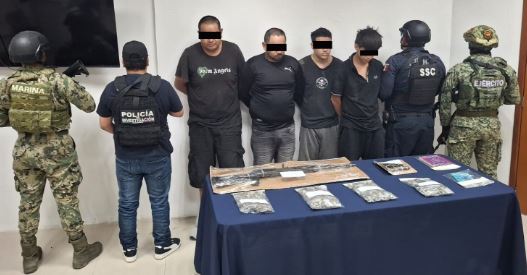En la acción también fueron detenidos Aarón “N”, Kevin Orlando “N” y Ever Eladio “N”. El operativo se realizó en la calle 33 Sur de la colonia Colonos Cuzamil, donde se aseguraron dosis de presunta marihuana, un arma larga y un arma corta calibre 9 mm, ambas con cargadores abastecidos y cartuchos útiles.