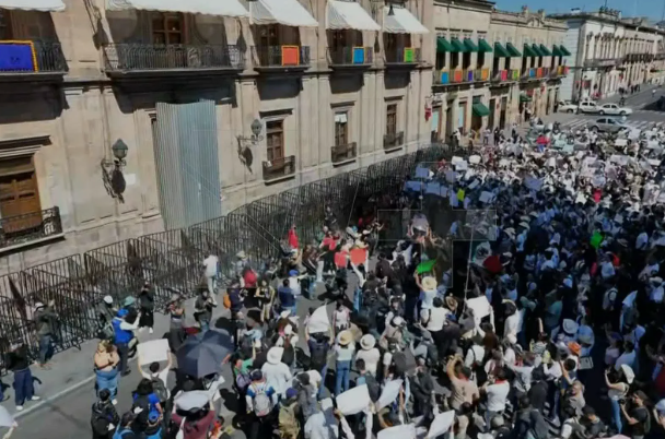 Este lunes, la capital michoacana presenció una nueva movilización. Estudiantes de diversas universidades se congregaron en puntos clave como el obelisco a Lázaro Cárdenas y la fuente de Las Tarascas, vistiendo de blanco para simbolizar la paz. Sin embargo, a medida que los contingentes avanzaban para converger en el centro de la ciudad, uno de los grupos desató serios disturbios en Morelia al llegar al Congreso del Estado. Con piedras y palos, destrozaron los ventanales de la sede del Poder Legislativo, lo que obligó a los oficiales del grupo antimotines a usar gas lacrimógeno para dispersar a los manifestantes y contener la agresión.