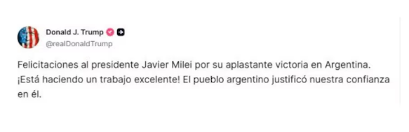 En su red social Truth, Trump reiteró su apoyo directo al líder argentino: “Felicitaciones al presidente Javier Milei por su aplastante victoria en Argentina. ¡Está haciendo un trabajo excelente! El pueblo argentino justificó nuestra confianza en él”. La publicación fue ampliamente compartida y generó reacciones entre aliados conservadores, quienes ven en la relación entre ambos mandatarios una oportunidad para reposicionar la región bajo un discurso liberal y promercado.