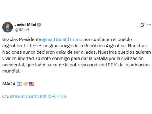 Por su parte, Milei respondió públicamente agradeciendo el gesto y calificando a Trump como “un gran amigo de la República Argentina”. “Nuestros pueblos quieren vivir en libertad. Cuente conmigo para dar la batalla por la civilización occidental, que logró sacar de la pobreza a más del 90% de la población mundial”, afirmó el mandatario, reforzando su discurso sobre la defensa del libre mercado y la cooperación internacional basada en afinidades ideológicas.