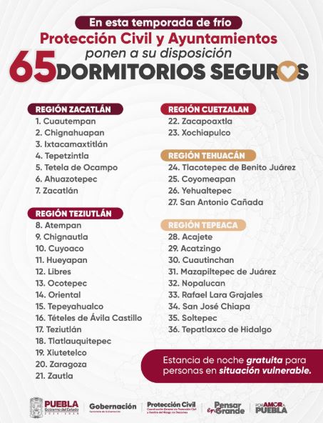 El programa se implementa principalmente en municipios de la Sierra Norte, Sierra Nororiental, Valle de Atlixco y la región de Serdán, donde las bajas temperaturas suelen impactar con mayor fuerza. Estos espacios funcionan como refugios temporales para quienes no cuentan con un lugar seguro donde resguardarse.