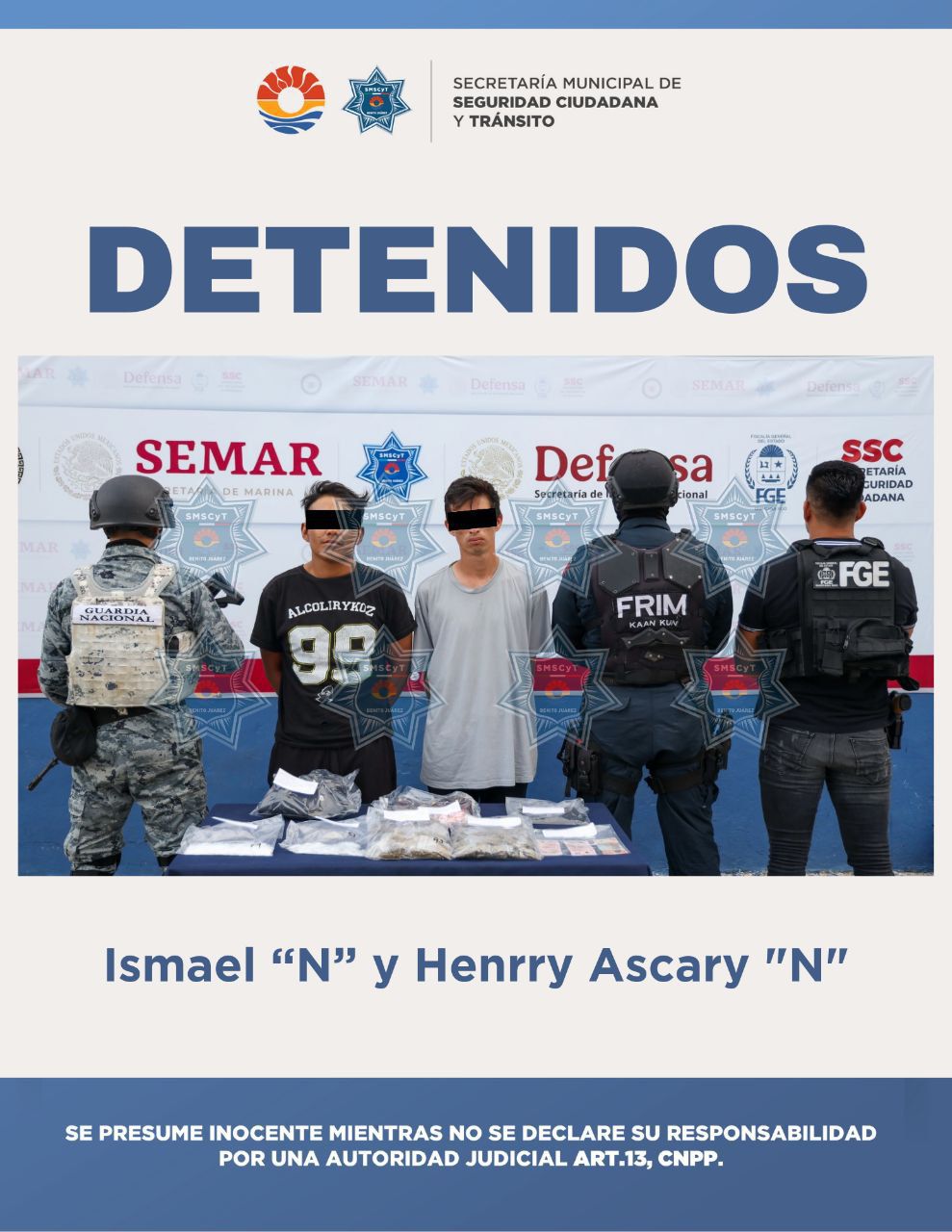 Los individuos fueron identificados como Ismael “N”, de 22 años de edad, y Henrry Ascary “N”, de 27 años. Debido a la cantidad de narcóticos encontrados en su posesión, ambos fueron formalmente detenidos en el lugar de los hechos. Inmediatamente después, fueron trasladados y puestos a disposición del Ministerio Público de la Fiscalía General del Estado, la instancia encargada de llevar a cabo las diligencias correspondientes para determinar su situación jurídica.
